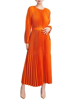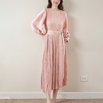 उच्च गुणवत्ता वाली महिलाओं की सुरुचिपूर्ण चमकदार पॉलिएस्टर मिडी ड्रेस विंटेज प्लेटेड डिजाइन लंबी आस्तीन ढीली गर्दन बेल्ट वाली कमर